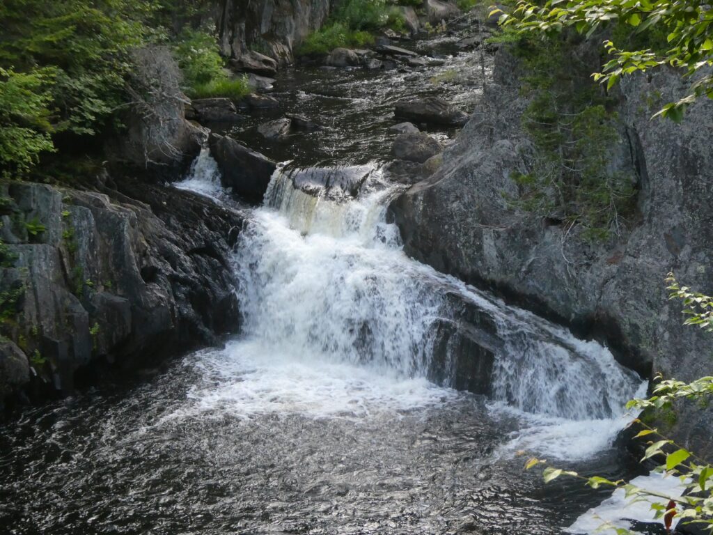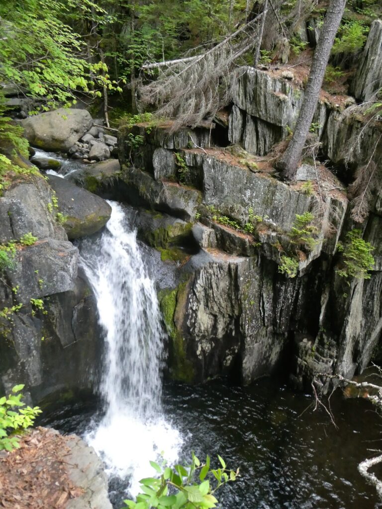 On the way back to Massachusetts, we did a few more hikes in Maine. The first was at Gulf Hagas (the “Grand Canyon of Maine”). This was a good hike through a gorge with several waterfalls. The rock in the canyon is vertical slate. The hike was difficult (we were also trying to do it quickly because it was getting dark) with lots of up and down as we followed the edge of the gorge. One big complaint about this hike is that access is only through a privately owned area and road that charges an exorbitant entrance fee.